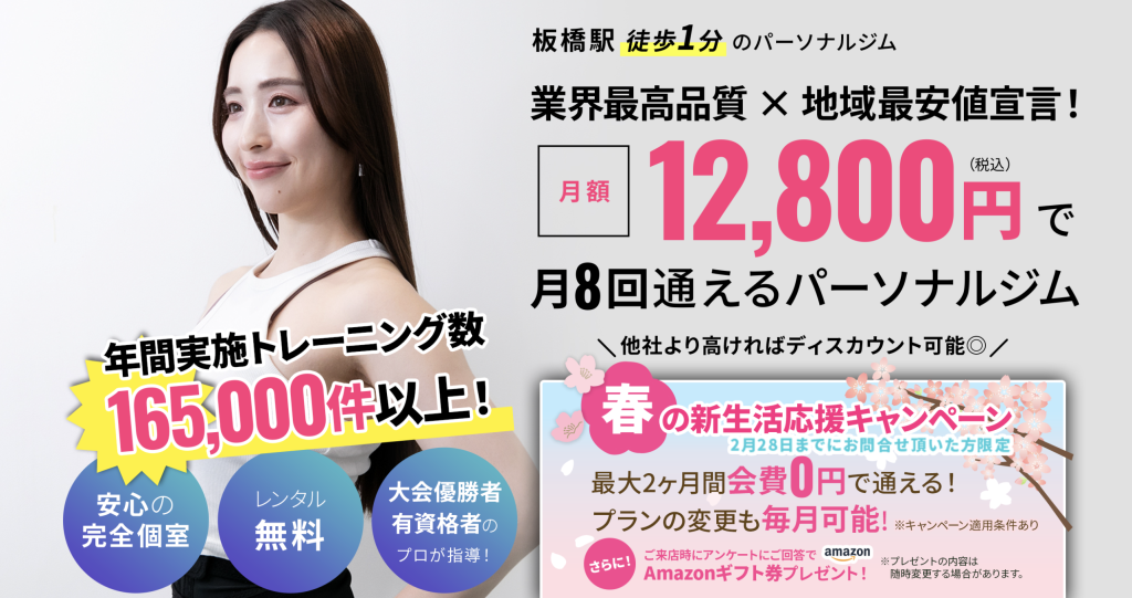 THE PERSONAL GYM 板橋店は、顧客一人ひとりの目標に合わせたオーダーメイドのトレーニングを提供するパーソナルジムです。国家資格保有トレーナーやボディメイク大会入賞者など、経験豊富なプロが指導を行い、質の高いトレーニングが特徴。 入会金無料で、回数券や月額制、食事指導付きコースなど料金プランも豊富。7時から23時まで営業しており、駅近で通いやすい立地も魅力です。無料体験も実施中で、手軽にプロの指導を体験できます。