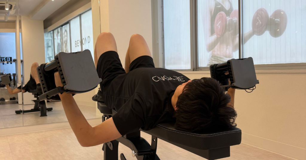 本日のY様のトレーニングは上半身の日ということで、胸、背中、最後に締めの腹筋という形で進めていきました。
