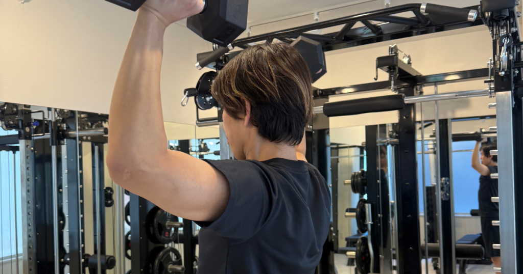 また、肩のトレーニングでは、ショルダープレスを立ちながら行うことにより、無理に胸を張らずに三角筋前部への刺激を入りやすくし、サイドレイズを座って行うことで体重移動によるチーティングを抑制し、最大限のパンプアップを感じていただくことができました!
